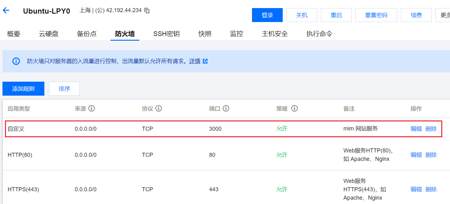 :启动服务。注:这里默认端口号 3000,使用腾讯云服务器时需要注意,要注意在防火墙中将端口号加入进去,不然无法访问,如图: